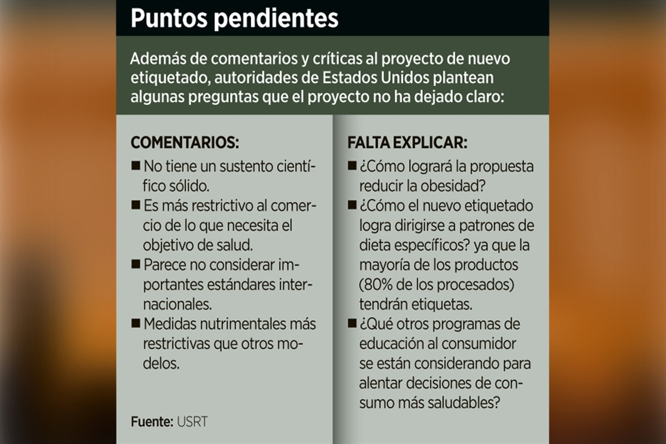 Estados Unidos solicitó un periodo mínimo de dos años para que se implemente el nuevo etiquetado de alimentos y bebidas en México, debido al impacto que tendrá la medida en la industria estadounidense que exporta distintos productos al País (Fuente).