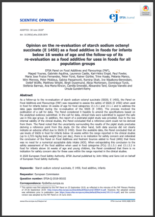 Unión Europea -EFSA: Dictamen sobre la reevaluación del octenilsuccinato sódico de almidón (E 1450) como aditivo alimentario en alimentos para lactantes menores de 16 semanas y el seguimiento de su reevaluación como aditivo alimentario para usos en alimentos para todos los grupos de población