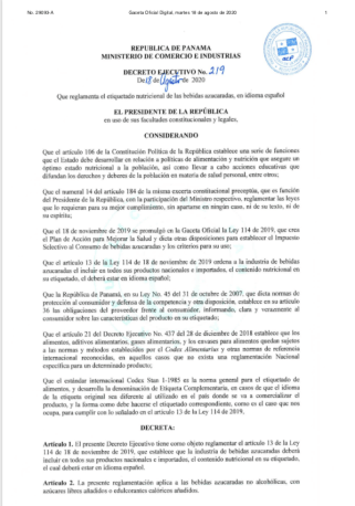 El decreto ejecutivo (Decreto Ejecutivo 219) tiene por objeto reglamentar el artículo 13 de la Ley 114, que establece que la industria de bebidas azucaradas deberá incluir en todos sus productos nacionales o importados, el contenido nutricional en su etiquetado, el cual, deberá estar en idioma español (Fuente).