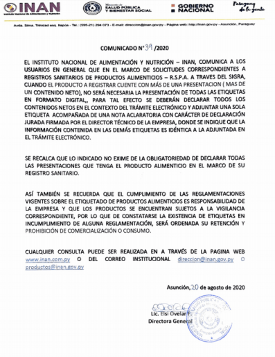 Cuando el producto a registrar cuente con más de una presentación ( más de un contenido neto), no será necesaria la presentación de todas las etiquetas en formato digital, para tal efecto se deberán declarar todos los contenidos netos en el contexto del trámite electrónico y adjuntar una sola etiqueta acompañada de una nota aclaratoria con carácter de declaración jurada firmada por el director técnico de la empresa, donde se indique que la información contenida en las demás etiquetas es idéntica a la adjuntada en el trámite electrónico (Fuente).