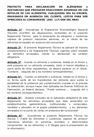 Por medio de la presente publicación se comunica el “Proyecto de reglamentación para declaración de alérgenos y sustancias que producen reacciones adversas en los rótulos de los alimentos, cualquiera sea su origen, envasados en ausencia del cliente, listos para ser ofrecidos al consumidor (Decreto 117/006 del RBN)”, el cual se encontrará disponible 60 a partir de la fecha de la publicación de este comunicado (Fuente).
