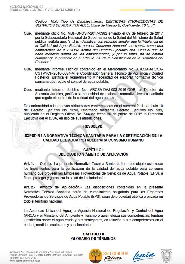 La presente Normativa Técnica Sanitaria tiene por objeto establecer los lineamientos para la certificación de la calidad del agua potable para consumo humano que proveen las Empresas Proveedoras de Servicios de Agua Potable (EPS), a fin de proteger y garantizar la salud de la ciudadanía (Fuente).