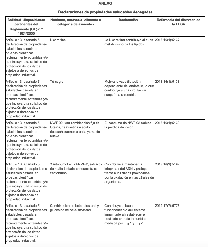 Reglamento (UE) 2021/77 de la Comisión de 27 de enero de 2021 por el que se deniega la autorización de determinadas declaraciones de propiedades saludables en los alimentos distintas de las relativas a la reducción del riesgo de enfermedad y al desarrollo y la salud de los niños (Fuente).