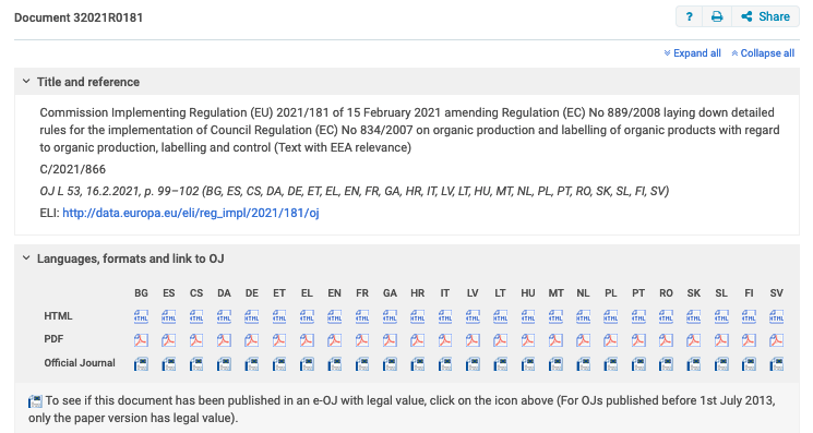 Reglamento de Ejecución (UE) 2021/181 de la Comisión, de 15 de febrero de 2021, que modifica el Reglamento (CE) nº 889/2008, por el que se establecen disposiciones de aplicación del Reglamento (CE) nº 834/2007 del Consejo sobre producción y etiquetado de los productos ecológicos, con respecto a la producción ecológica, su etiquetado y su control (Fuente).
