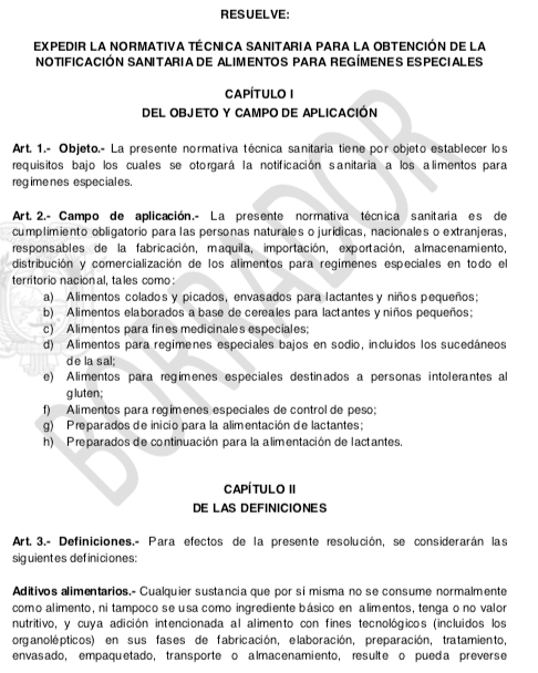 La presente normativa técnica sanitaria es de cumplimiento obligatorio para las personas naturales o jurídicas, nacionales o extranjeras, responsables de la fabricación, maquila, importación, exportación, almacenamiento, distribución y comercialización de los alimentos para regímenes especiales en todo el territorio nacional (Fuente).
