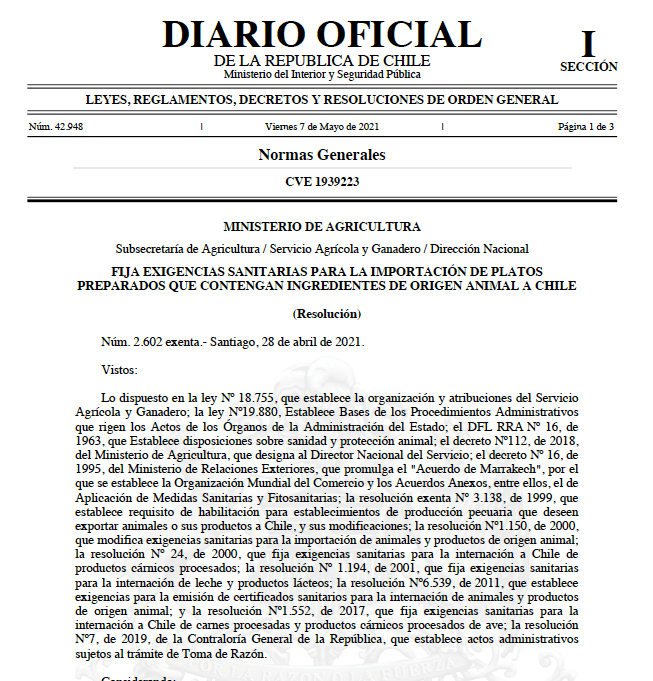 El Ministerio de Agricultura, mediante la Resolución Exenta No 2.602, establece que toda partida de platos preparados que se importe al territorio nacional debe presentar la respectiva certificación sanitaria, en la que conste el cumplimiento de los requisitos y exigencias establecidas en la presente resolución, debiendo haber sido extendida por la autoridad sanitaria competente del país de origen, en el idioma oficial del país de procedencia y en español (Fuente).