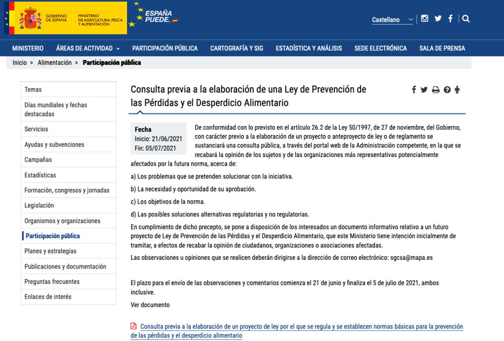 El Gobierno ha iniciado el trámite de consulta pública del anteproyecto de ley contra el desperdicio alimentario debido a su objetivo de ser “más ambicioso” en esta lucha y tras descartar opciones como dejar en manos de las comunidades autónomas su regulación (Fuente).