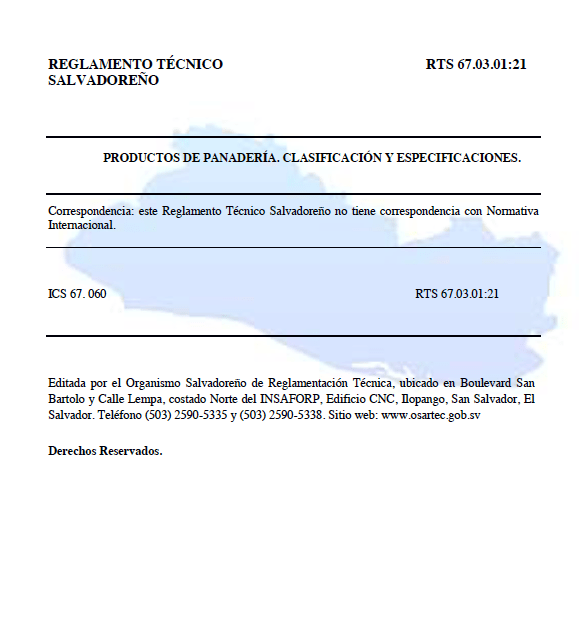 El Gobierno de El Salvador, informa que el 11 de diciembre de 2003 notificó a la OMC con la signatura G/TBT/N/SLV/37 el proyecto de norma “NSO 67.30.01:03 PRODUCTOS DE PANADERÍA. CLASIFICACIÓN Y ESPECIFICACIONES.”