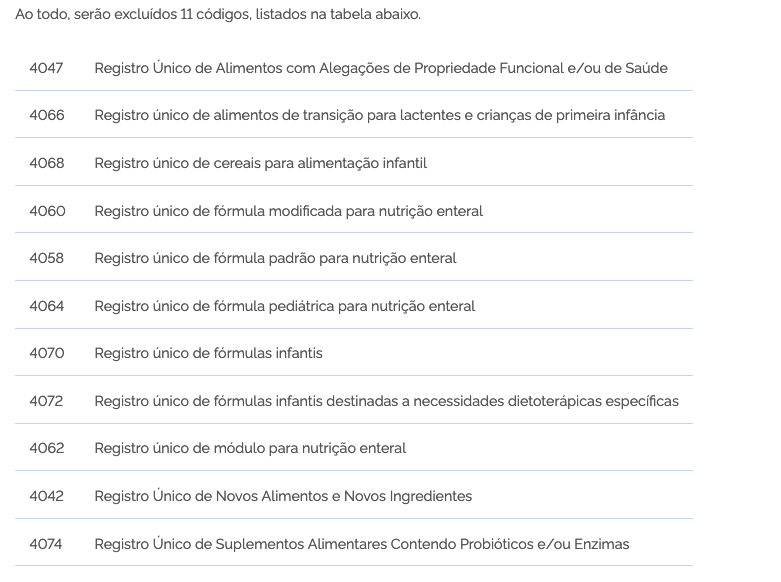 Anvisa informa a las empresas del sector regulado que excluirá los códigos de materias relacionados con el registro único de productos alimenticios. La acción forma parte de un conjunto de medidas para mejorar y simplificar los procesos internos de trabajo, con el objetivo de agilizar las peticiones electrónicas y el análisis de las solicitudes (Fuente).