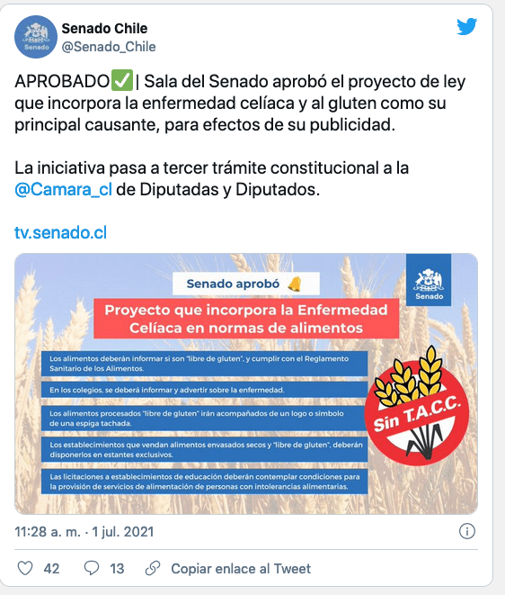 La sala del Senado dio su respaldo de manera unánime a el proyecto que incorpora a la enfermedad celíaca y al gluten en la legislación sobre composición de los alimentos y su rotulación. Destacando la necesidad de establecer una política pública en materia de alimentación saludable (Fuente).