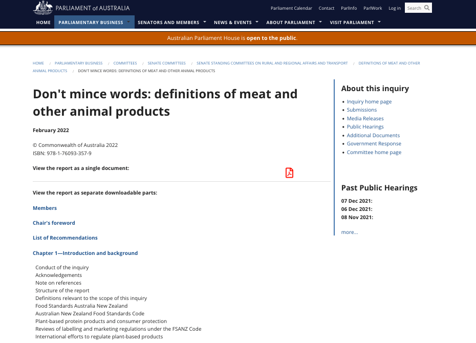Since June 2021, the committee took submissions and heard evidence from beef, poultry, and pork farmers, seafood sellers, dairy companies, consumer advocates and plant-protein sector representatives including global brands.