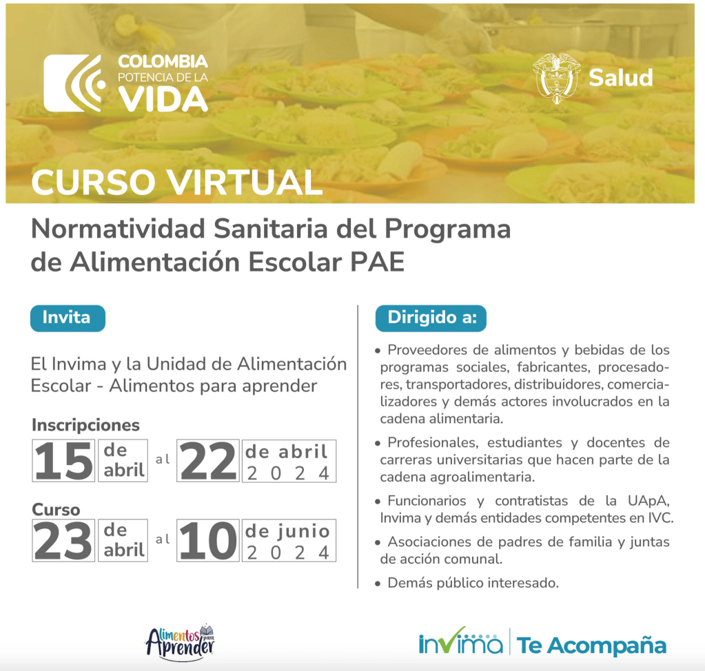 The Instituto Nacional de Vigilancia de Medicamentos y Alimentos (INVIMA in Spanish) and the Unidad de Alimentación Escolar -Alimentos para Aprender (UApA in Spanish) inform those interested that, from April 15 to 22, registrations are open for the Virtual Course on Sanitary Regulations of the School Feeding Program (PAE in Spanish) to be held from April 23 to June 10, 2024.