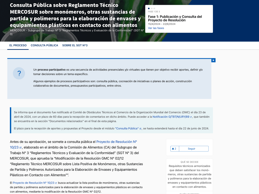 Draft Resolution No. 10/23 seeks to update the positive list of monomers, other starting substances and polymers authorized for the manufacture of plastic containers and equipment in contact with food, by amending Resolution GMC No. 02/12.