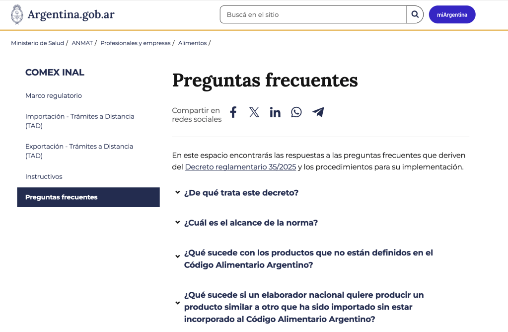The National Food Institute (INAL in Spanish) has published a series of questions and answers to clarify doubts related to Regulatory Decree No 35/2025, which establishes the procedures for the import and export of food and materials, containers and utensils intended to be in contact with food.