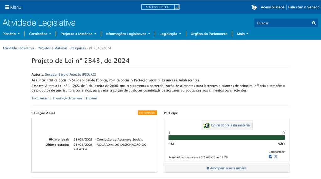 The Senate Committee on Human Rights and Participative Legislation (CDH in Portuguese) approved Bill 2.343/2024, which amends Law 11.265, which regulates the commercialization of food for infants and young children, prohibiting the addition of any amount of sugar and sweeteners to food intended for infants.