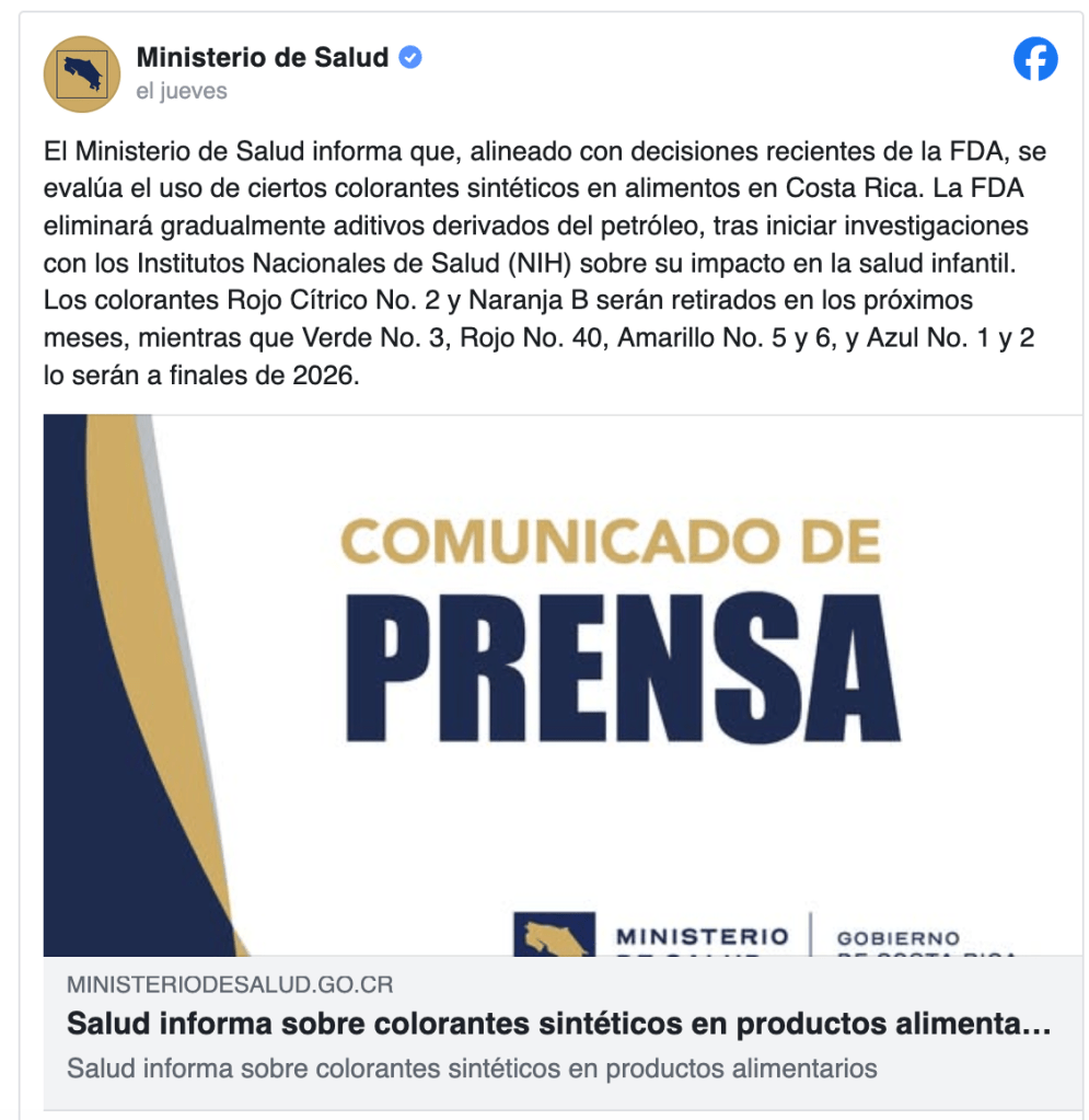 Against this backdrop, the Ministry calls on the food industry to review its formulas and consider natural coloring alternatives, in line with international public health best practices. It also informs that a technical process of revision of the authorized colorants in Costa Rica will be initiated, taking as a reference the recommendations and findings of international organizations such as CODEX and regulatory authorities such as the FDA and the EFSA (European Food Safety Authority), among others.