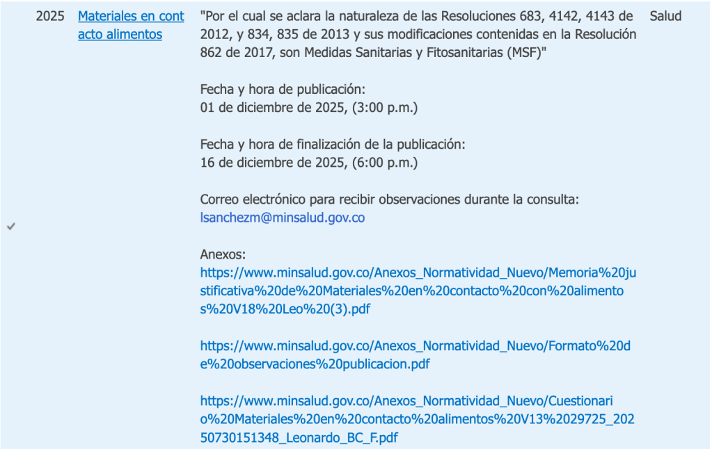 The Ministry of Health and Social Protection has published a draft resolution aimed at redefining the regulations on food-contact materials (Resolutions 683, 4142, and 4143 of 2012; 834 and 835 of 2013; and Resolution 862 of 2017) as Sanitary and Phytosanitary Measures (SPS) under the World Trade Organization (WTO) Agreement.