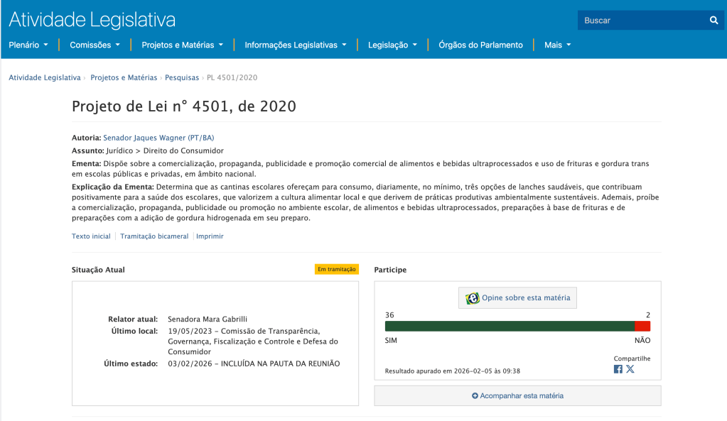 Bill 4.501/2020, drafted by Senator Jaques Wagner (PT-BA), proposes a series of regulations prohibiting the sale and distribution of ultra-processed (highly industrialized) foods and beverages or those high in calories, sugar, and fat in educational establishments. Additionally, the text requires cafeterias to offer healthy snack options or those tailored to individuals with dietary restrictions (such as diabetics and celiacs).