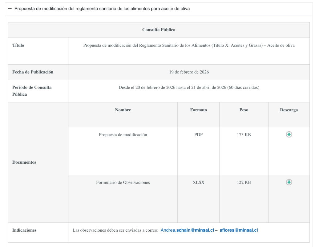 Ministry of Health (MINSAL in Spanish) has published the public consultation “Proposal for the modification of the Sanitary Regulation of Food (Title X: Oils and Fats) – Olive Oil.” The objective of the proposal is to incorporate into the Regulation