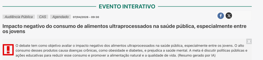 The permanent committees of the Senate are debating and voting this week on various topics. Among the most notable topics are the hearings on the consumption of ultra-processed foods. The debate seeks to evaluate the negative impact of ultra-processed foods on public health, especially among young people. The objective is to analyze public policies and educational actions to reduce this consumption and promote natural foods and a better quality of life.