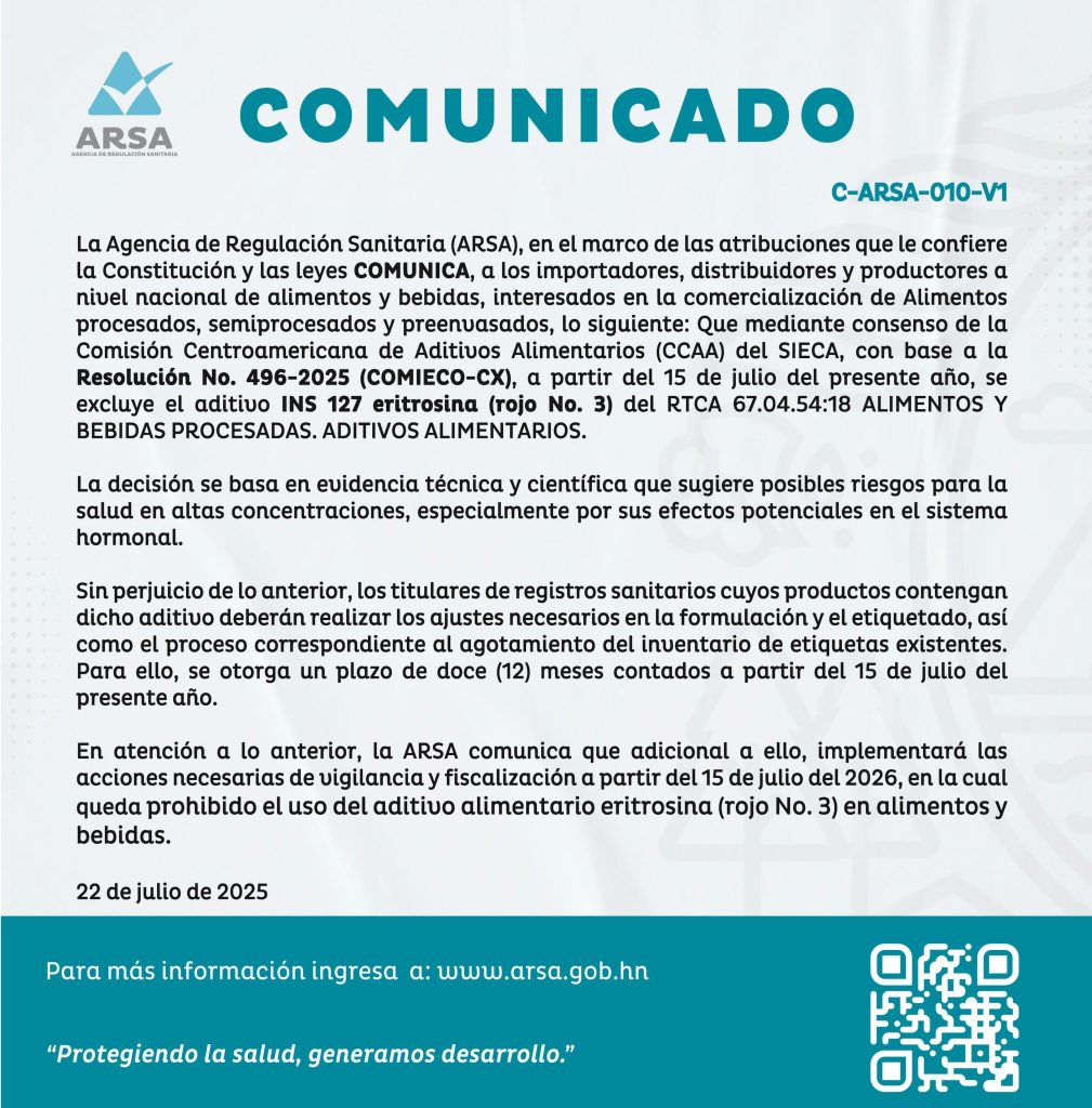 The Health Regulatory Agency (ARSA in Spanish) has issued a statement directed at national importers, distributors, and producers of food and beverages who are interested in the commercialization of processed, semi-processed, and pre-packaged foods, as follows: That through consensus from the Central American Commission of Food Additives (CCAA in Spanish) of SIECA, based on Resolution No. 496-2025 (COMIECO-CX), effective from July 15 of this year, the additive INS 127 erythrosine (red No. 3) is excluded from RTCA 67.04.54:18 PROCESSED FOODS AND BEVERAGES. FOOD ADDITIVES. This decision is based on technical and scientific evidence suggesting potential health risks at high concentrations, particularly regarding its possible effects on the hormonal system. Notwithstanding the above, holders of sanitary registrations whose products contain this additive must make the necessary adjustments in formulation and labeling, as well as the corresponding process for depleting existing label inventory. To this end, a period of twelve (12) months is granted, starting from July 15 of this year.