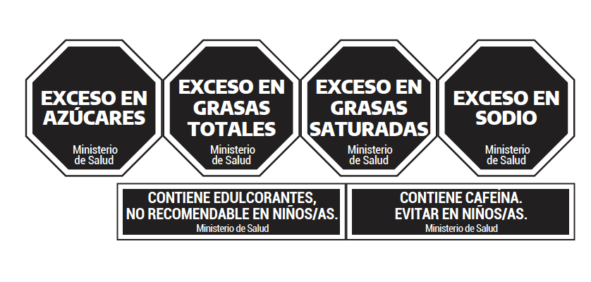 Processed foods and beverages must bear black octagons of at least 5% of the size of the main face of the container when its composition exceeds a minimum threshold in each of these components.