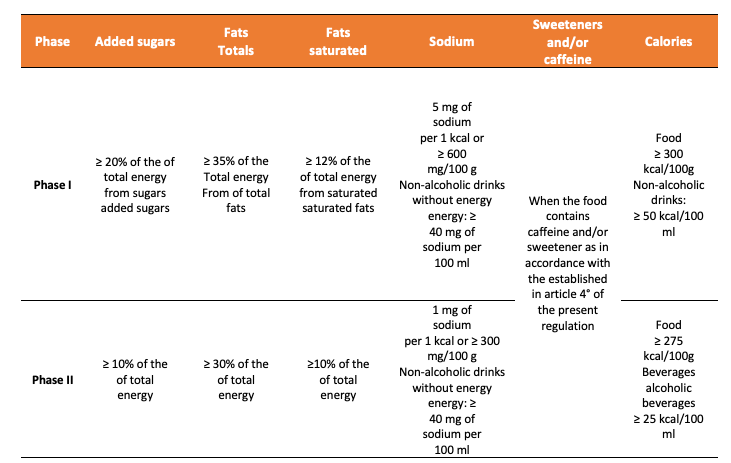 The criteria of the nutrient profile model are set according to the following cut-off points for critical nutrients (added sugars, saturated fat, total fat and sodium) and/or sweeteners and/or caffeine and/or calories, according to values proposed by PAHO, and other types of warnings such as the presence of sweeteners or caffeine.