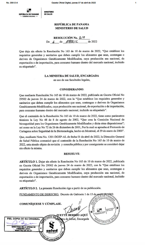 The Americas – Panama: Ministry of Health repeals resolution on food containing or derived from genetically modified organisms